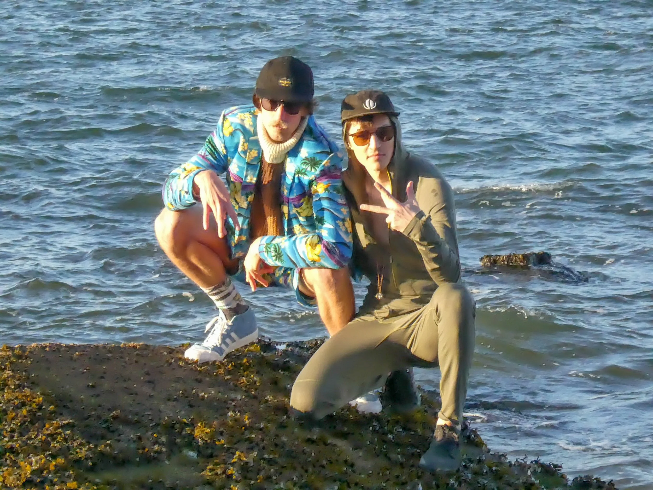 We tear off down to the beach and start filming — skateboard follow cams, jumping off logs, hoot’n and hollering — while trying to sync a speaker and match our beat to the lyrics we wrote half an hour ago. A tough ask.